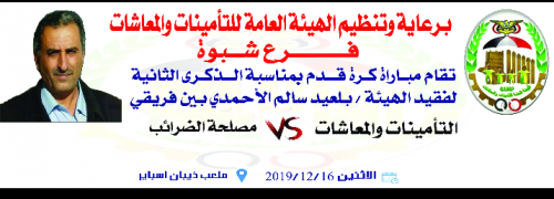 إقامة مباراة ودية على كأس الذكرى الثانية لفقيد الهيئة / بلعيد الاحمدي بين التأمينات والضرائب يشهد ملعب ذيبان اسباير عتق عصر غداً الأثنين المباراة الودية المرتقبة التي ستجمع بين فريق التأمينات...