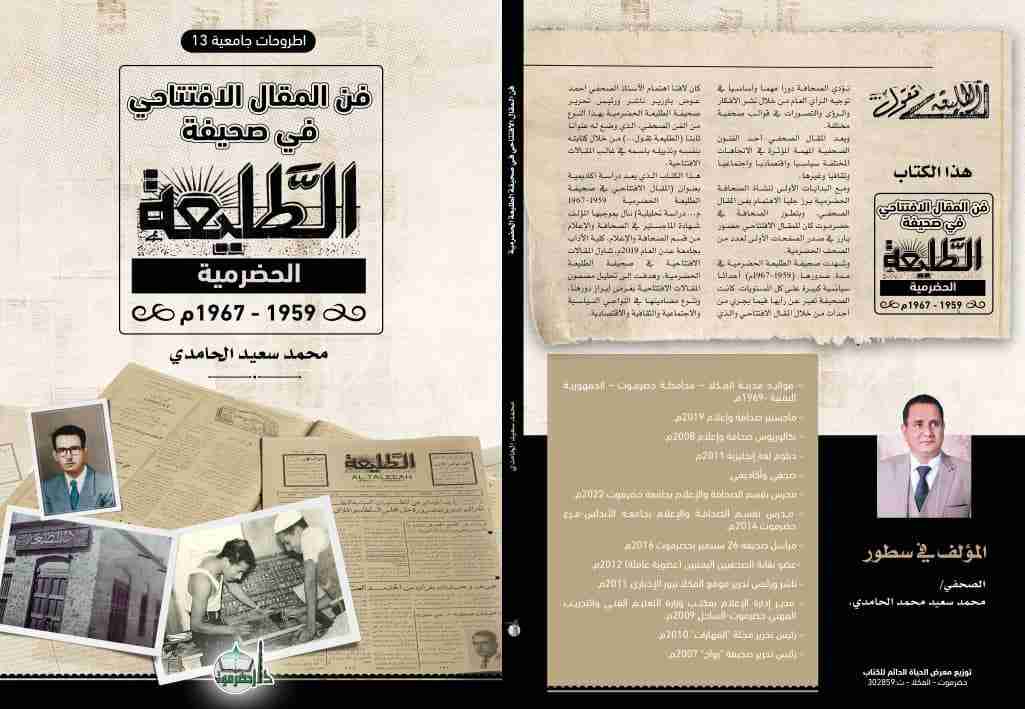 صدور كتاب "فن المقال الافتتاحي في صحيفة الطليعة الحضرمية"...للصحفي و الأكاديمي محمد سعيد الحامدي صدر حديثا للصحفي وعضو هيئة التدريس المساعدة بقسم الصحافة والاعلام بجامعة حضرموت محمد سعيد الحامدي كت...