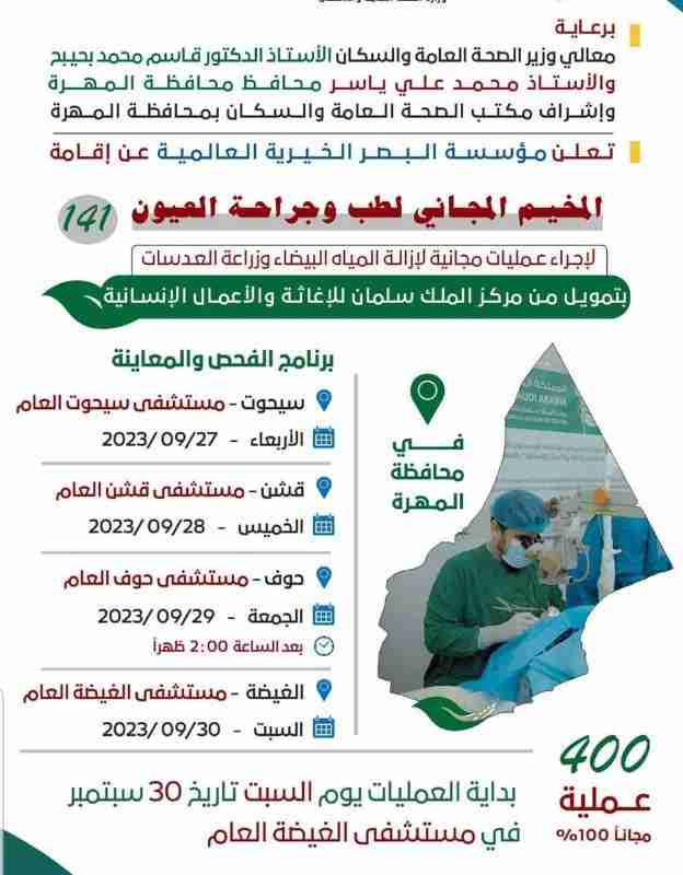 الأربعاء القادم.. انطلاق المخيم المجاني لطب وجراحة العيون بتمويل من مركز الملك سلمان للإغاثة ينطلق الأربعاء القادم بمحافظة المهرة المخيم الجراحي المجاني لطب وجراحة العيون والذي تقيمه مؤسسة البص...