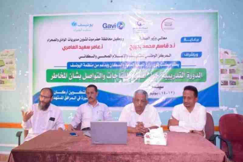 دورة تدريبية حول أهمية اللقاحات والتواصل بشان المخاطر بسيئون بدأت بمكتب وزارة الصحة العامة والسكان بحضرموت الوادي والصحراء بمدينة سيئون أمس، الدورة التدريبية حول...