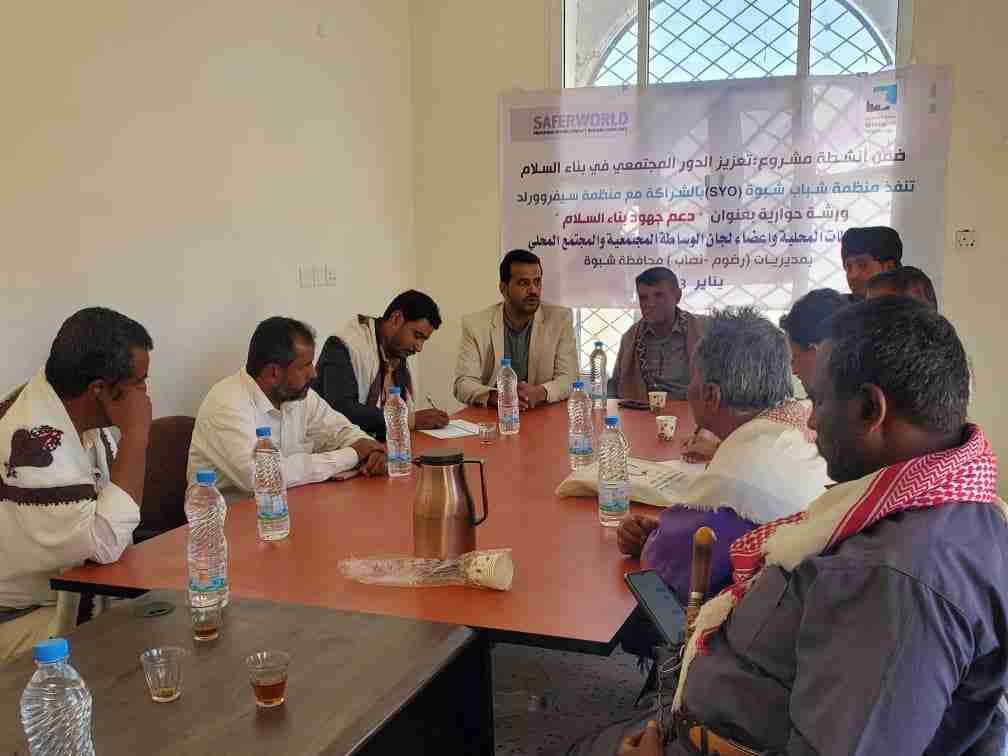 منظمة شباب شبوة تقييم ورشة حوارية لدعم جهود بناء السلام بالمحافظة نفذت منظمة شباب شبوة الورشة الحوارية الثانية لدعم جهود بناء السلام بالمحافظة بمشاركة ممثلي السلطة ال...