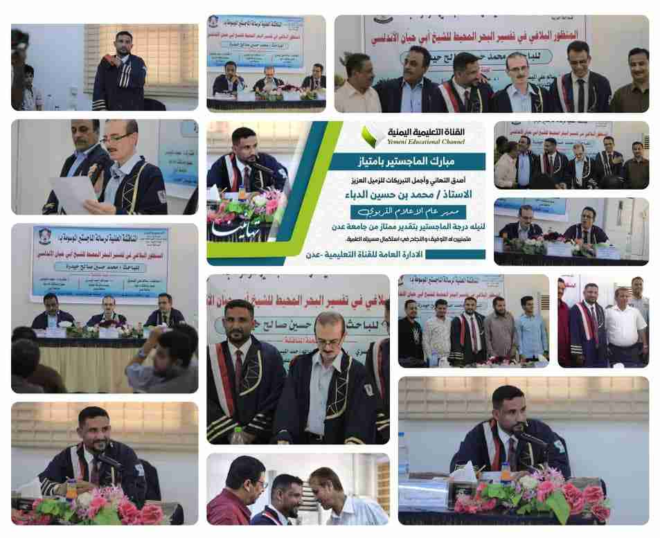 الماجستير بامتياز لمدير الإعلام والنشر التربوي الباحث محمد حسين الدباء من جامعة عدن منحت جامعة عدن الباحث محمد حسين صالح حيدرة الدباء (مدير عام إدارة الإعلام والنشر التربوي بوزارة التر...