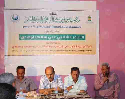 مؤسسة الأمل ومركز حضرموت ينظمان فعالية ثقافية عن الشاعر الشعبي علي بامهدي شهدت قاعة الفقيد هاني الباص بمركز الأمل للتنمية والأسر المنتجة ببروم مساء اليوم فعالية ثقافية...