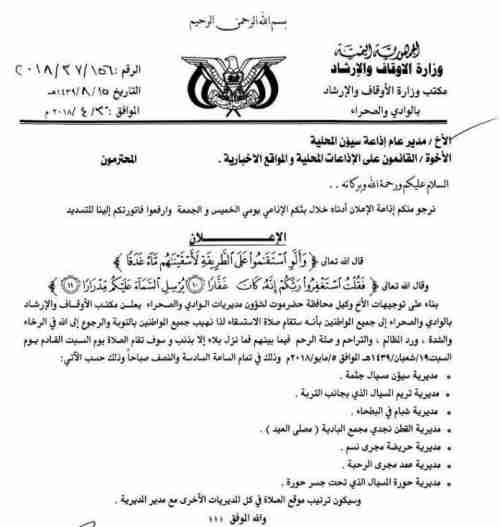مكتب الاوقاف والارشاد بوادي حضرموت يعلن عن صلاة استسقاء وجه مكتب الاوقاف والارشاد بمديريات حضرموت الوادي والصحراء اعلان الى جميع المواطنين عن اقامة صلاة الا...