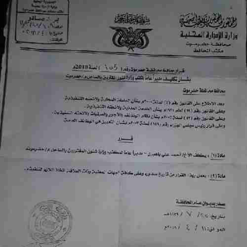 محافظ حضرموت يصدر قراراً بتكليف مدير لمكتب شئون المغتربين بساحل حضرموت أصدر محافظ حضرموت قائد المنطقة العسكرية الثانية اللواء الركن فرج سالمين البحسني القرار رقم (105) لسن...