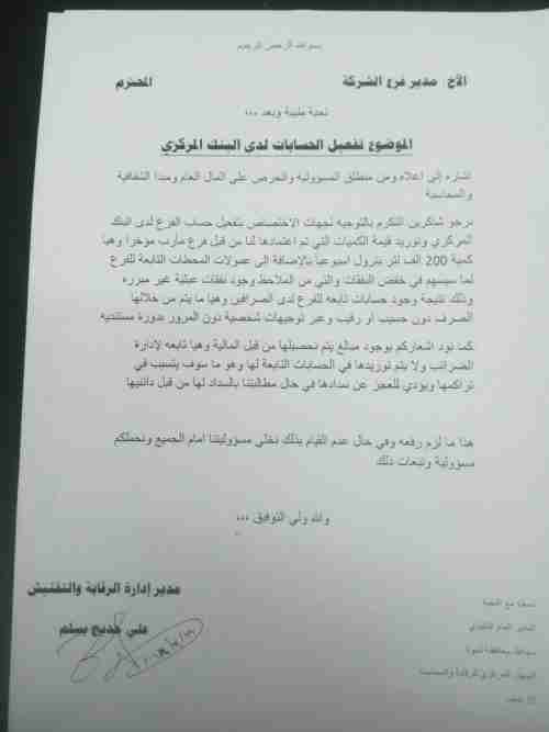 مدير الرقابة يطالب إدارة فرع شركة النفط بشبوة تفعيل الحسابات بالبنك المركزي قدم صباح اليوم الأثنين 19 مارس 2018م، علي حديج يسلم مدير إدارة الرقابة والتفتيش في فرع شركة النفط بم...