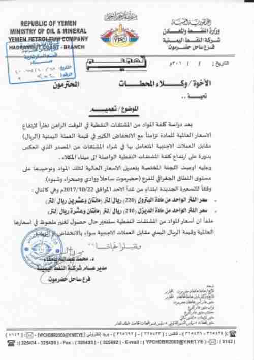 شركة النفط اليمنية بساحل حضرموت ترفع سعر المشتقات النفطية في حضرموت وشبوة والإدارة العامة تعترض أدى قرار شركة النفط اليمنية فرع ساحل حضرموت، برفع سعر المشتقات النفطية في كافة المحطات اعتبارا من ال...