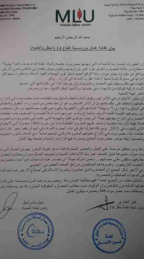 بيان نقابة عمال بترومسيلة قطاع-14 إن التطورات المتسارعة للاحداث التي شهدتها حضرموت خاصه والبلاد عامه قد فرضت واقعاً جديداً استطاع من...