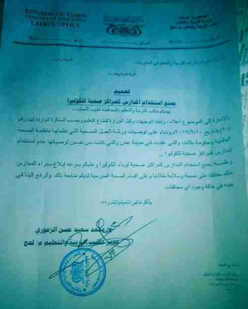 الدكتور الزعوري يصدر تعميم بمنع استخدام المدارس كمراكز صحية لوباء الكوليرا بلحج اصدر مدير عام مكتب التربية و التعليم بلحج الدكتور محمد سعيد الزعوري تعميم موجة الى مدراء إدارات مك...