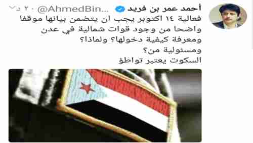 القيادي الجنوبي بن فريد يدلي بتصرح هام نص التصريح شاهد الصورة استنكر القيادي الجنوبي "احمد عمر بن فريد"، وجود قوات شمالية في العاصمة الجنوبية عدن، مطالب الجنوبي...