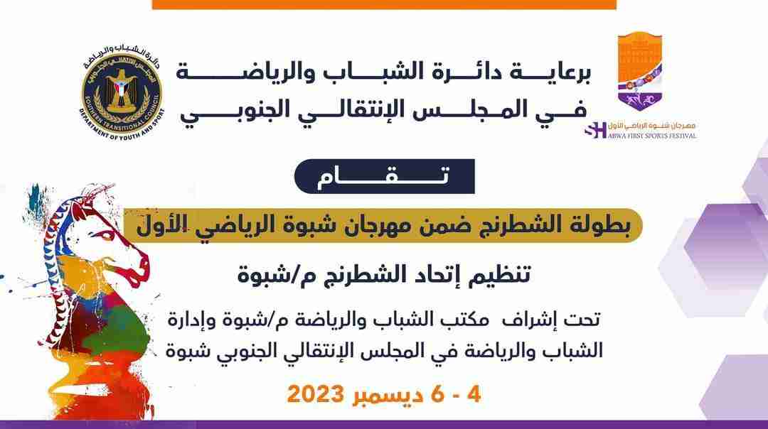 غداً الاثنين إنطلاق منافسات بطولة الشطرنج بمشاركة "16" ناديً من أندية محافظة شبوة تحتضن قاعة المكتب المركز الثقافي م/شبوة اليوم الأثنين إنطلاق منافسات بطولة الشطرنج للأندية ضمن فعالي...