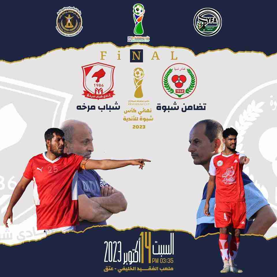 السبت شباب مرخه يواجه التضامن في نهائي كأس محافظة شبوة للأندية 2023 برعاية دائرة الشباب والرياضة في المجلس الإنتقالي الجنوبي، وتحت إشراف مكتب الشباب والرياضة م/شبوة وإد...