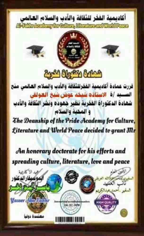 أكاديمية الفخر للثقافة والأدب والسلام العالمي تمنح الاستاذه/ شيخه عوض العولقي شهادة الدكتوراة الفخرية عدن الحدث / عادل القباص منحت أكاديمية الفخر للثقافة والأدب والسلام العالمي بقيادة عميد الأكاديمية ال...