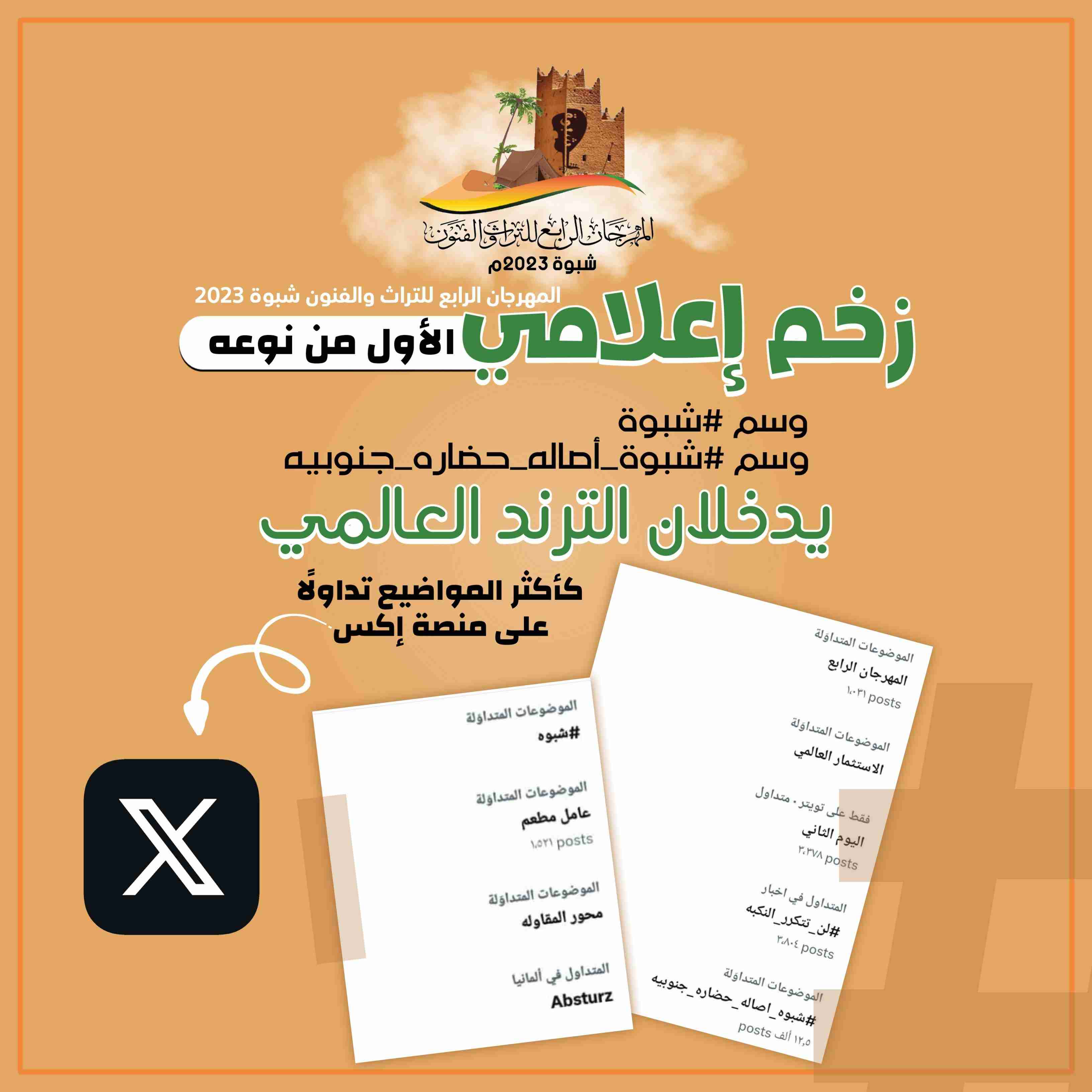 مهرجان شبوة الرابع يحقق زخمًا إعلاميًا استثنائيًا ويجعل وسم #شبوة_أصالة_حضارة_جنوبية يتصدر الترند العالمي حقق مهرجان شبوة الرابع للتراث والفنون زخمًا إعلاميًا لم يسبق له مثيل، تماشيًا مع رؤية الجنوب القوية...