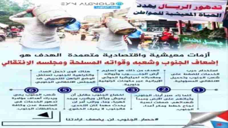 تأزيم الوضع المعيشي بالجنوب.. ما الخيارات المتاحة لمواجهتها؟ كل من يعمل بحقد وخسة ضمير على تأزيم الوضع المعيشي والخدمي بالجنوب سيكتوي بغضب الشعب ونقمته وإرادته ا...