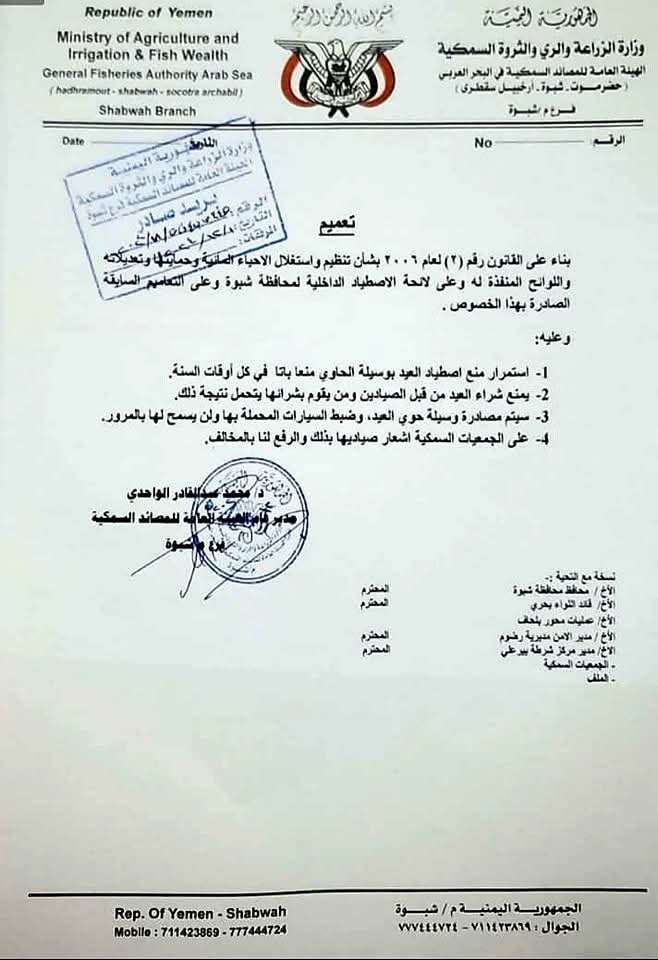 شبوة: الهيئة العامة للمصايد السمكية تعمم باستمرار منع اصطياد العيد بواسطة وسيلة الحوي في كل أوقات السنة. أصدر مدير الهيئة العامة للمصائد السمكية، الدكتور محمد عبدالقادر الواحدي، تعميماً باستمرار منع اصطياد...