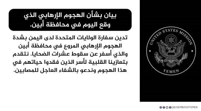 الولايات المتحدة الأمريكية تدين العملية الإرهابية التي استهدفت القوات الجنوبية في أبين أدانت سفارة الولايات المتحدة لدى اليمن بشدة الهجوم الإرهابي المروع الذي وقع اليوم في محافظة أبين، وا...