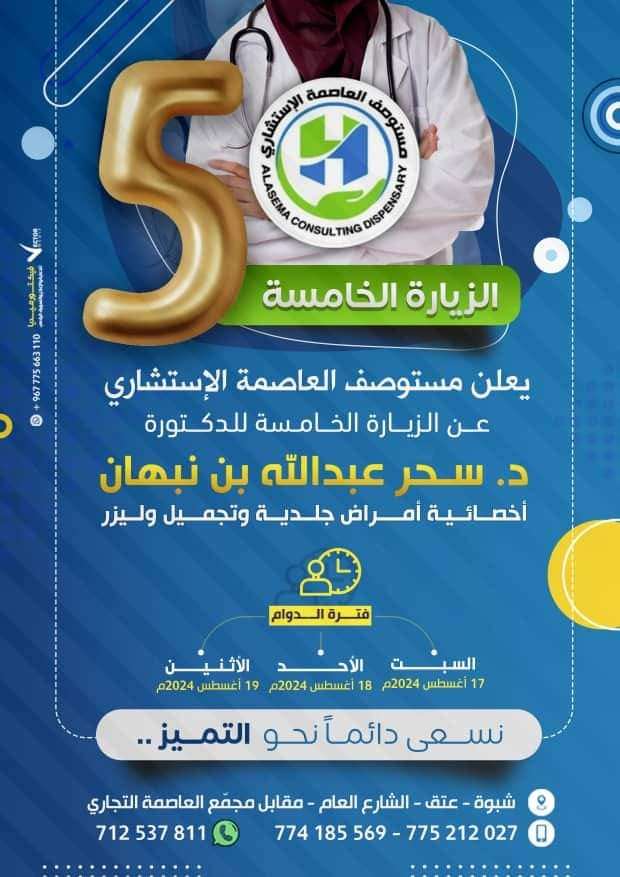 مستوصف العاصمة الاستشاري بشبوة يعلن عن وصول الدكتورة سحر بن نبهان أخصائية أمراض جلدية وتجميل وليزر للمرة الخامسة أعلن مستوصف العاصمة الإستشاري في محافظة شبوة، عن وصول الدكتورة سحر عبدالله بن نبهان، أخصائية أمراض ج...