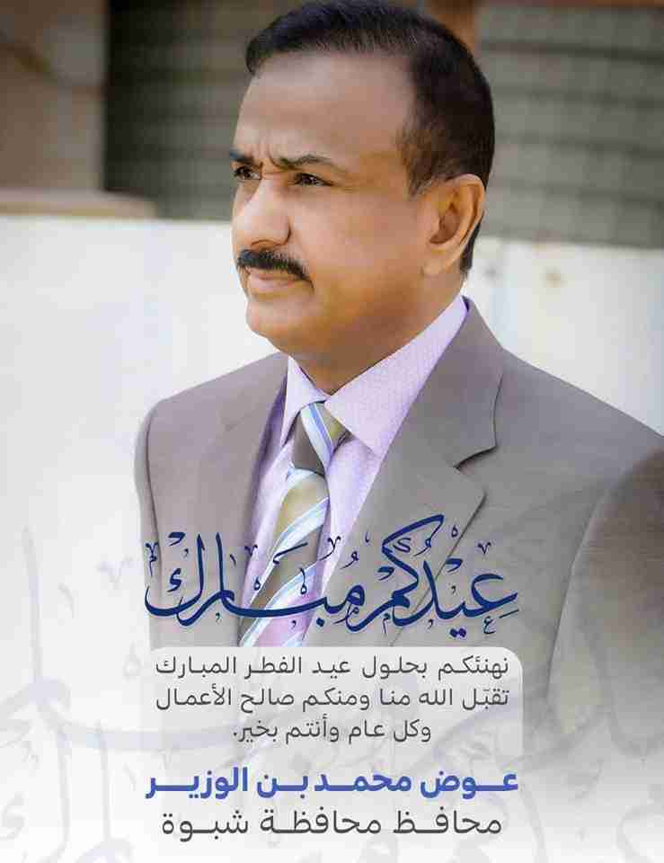 محافظ شبوة بن الوزير يرفع أسمى التهاني والتبريكات لأبناء المحافظة بعيد الفطر المبارك. بمناسبة حلول عيد الفطر المبارك رفع محافظ محافظة شبوة، رئيس المجلس المحلي عوض محمد بن الوزير أسمى آيا...
