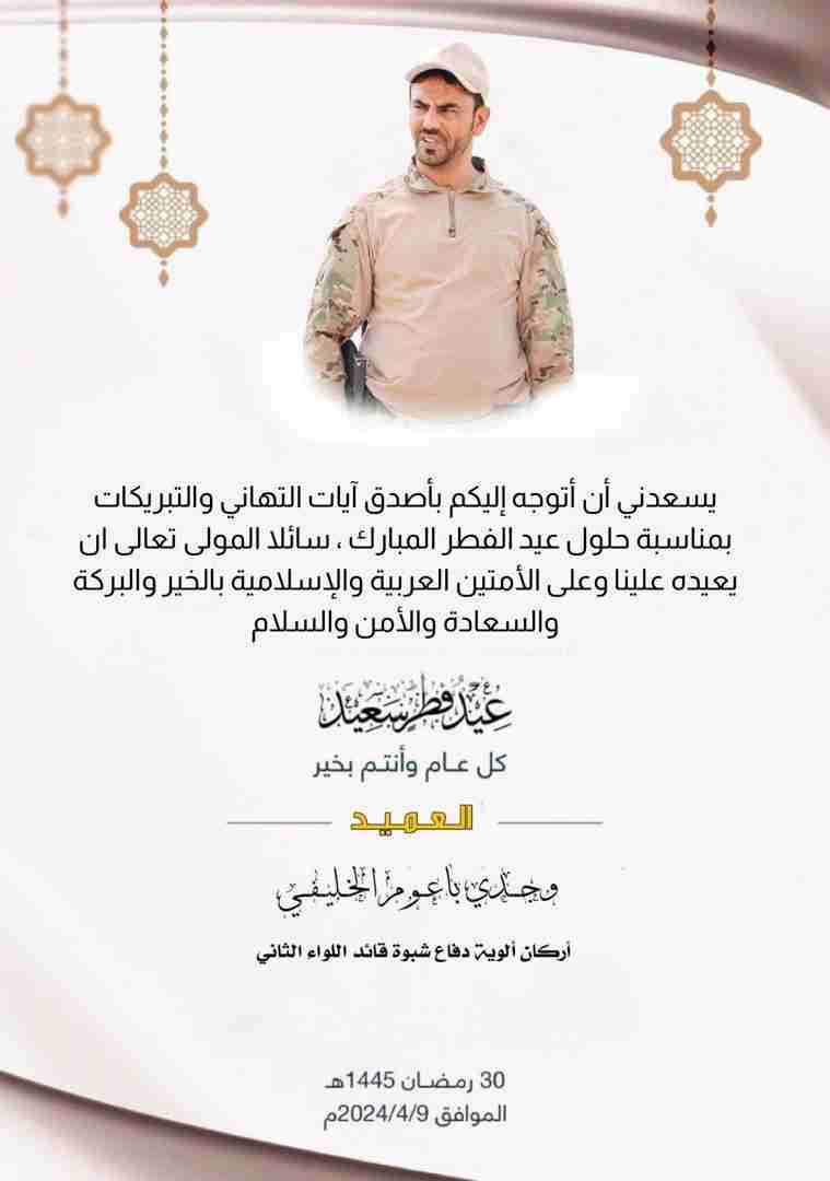 العميد وجدي باعوم يهنئ ابطال قوات دفاع شبوة المرابطين في الثغور والجبهات بمناسبة عيد الفطر المبارك قدم أركان قوات دفاع شبوة قائد اللواء الثاني العميد وجدي باعوم الخليفي التهنئة إلى جميع منتسبي القوات...