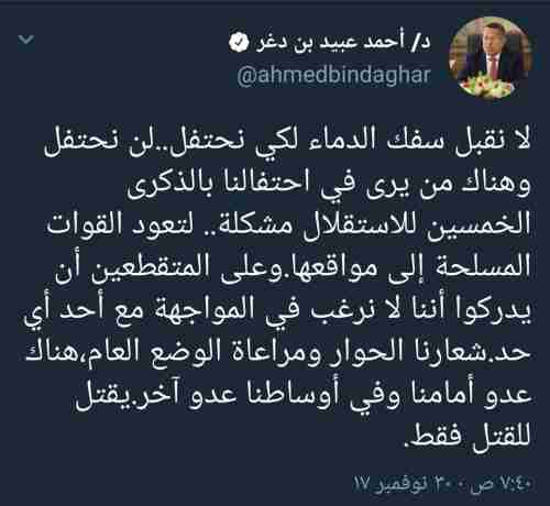 بن دغر يعلن الغاء الاحتفال بذكرى الاستقلال عقب اشتباكات تعرف على الأسباب اعلن رئيس الوزراء احمد عبيد بن دغر الغاء احتفال حكومي كان مقررا له ان يقام بالكلية العسكرية بصلاح...