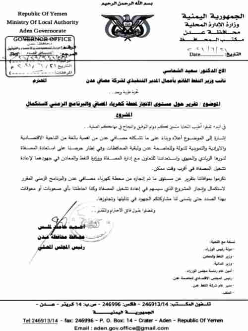 المحافظ لملس يطالب وزارة النفط باستكمال تأهيل مشروع المحطة الكهربائية لمصافي عدن طالب محافظ عدن، أحمد حامد لملس، وزارة النفط باستكمال مشروع إعادة تشغيل المحطة الكهربائية ل...