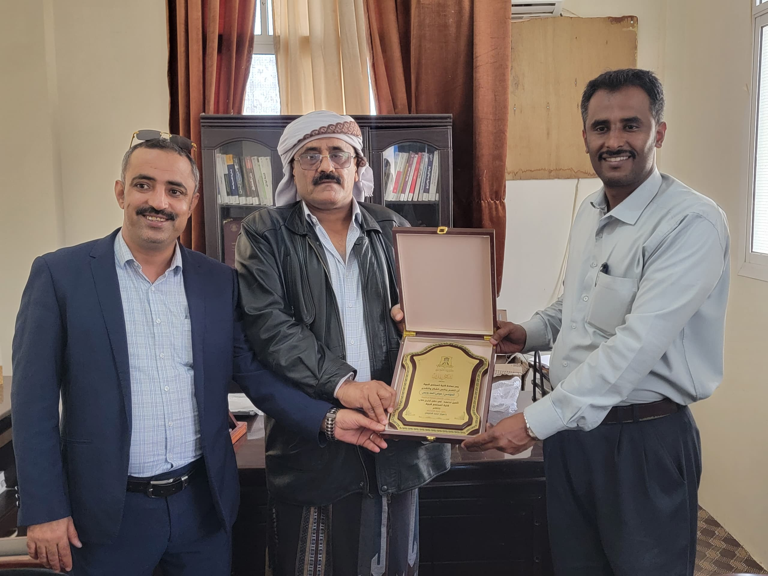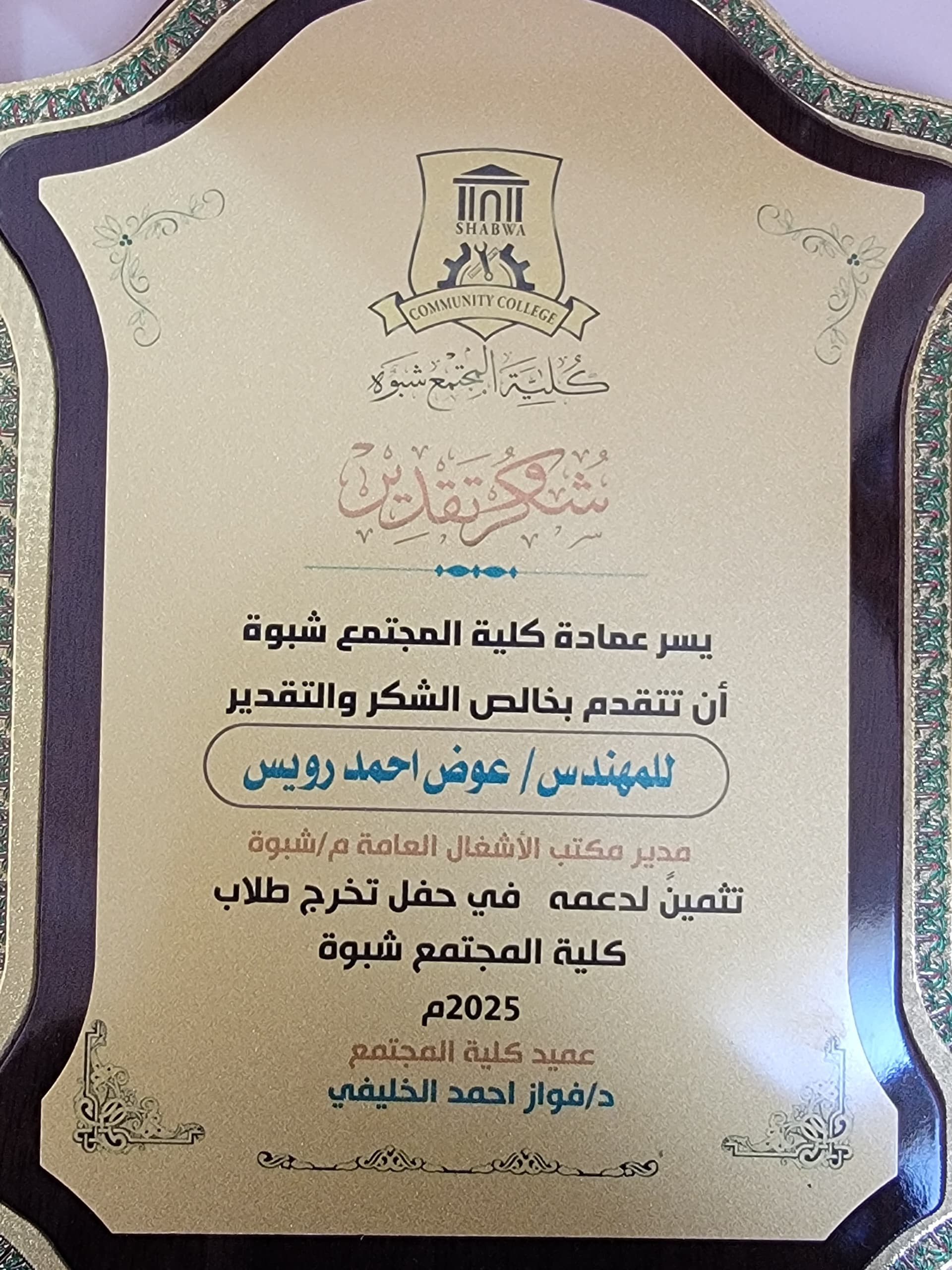 وفاءً لعطائه في صرح كلية المجتمع.. درع شكر وتقدير لمدير أشغال شبوة من الوكيل الطوسلي والدكتور الخليفي."