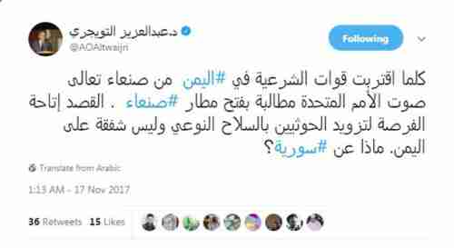 كشف الدكتور عبدالعزيز التويجري، مدير عام منظمة (الإيسيسكو)، عن تواطئ الأمم المتحدة مع الحوثيين في اليمن، بطريقة غير مباشرة. وقال "التويجري"، في تغريدة له عبر "تويتر"،   " كلما اقتربت قوات الشرعية في #اليمن من صنعاء تعالى صوت الأمم المتحدة مطالبة بفتح مطار #صنعاء,, القصد إتاحة الفرصة لتزويد الحوثيين بالسلاح النوعي وليس شفقة على اليمن