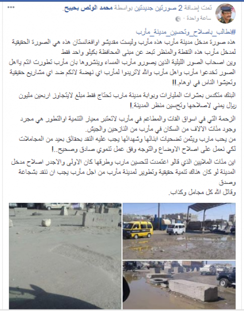 حولت الالة الاعلامية الاخوانية محافظة مأرب الى مدينة باريسية في الاعلام، فيما على ارض الواقع لا تزال مأرب في عبث وتدهور نتيجة الفساد الذي يمارسه الاخوان بالمحافظة. والى جانب معاناة أبناء مأرب من الاقصاء والتهميش الذ يمارسه الاخوان المسلمين " حزب التجمع اليمني للاصلاح " المصحوب باعتقالات واخفاء قسري لأبناء مأرب الذين يقبع العشرات منهم في سجون سرية للاخوان بتهمة " التحوث "، تشهد مأرب فساد ضخم وفشل اخواني في قيادتها وادارة مرافقها التي يتم التعيين فيها بأوامر عسكرية لمدراء من خارج مأرب. وشبه شيخ قبلي وقيادي عسكري مأربي محافظتهم وكأنها مقديشو او افغانستان، في اشارة منه الى مليشيات الاخوان التي حولت مأرب الى ثكنات عسكرية دون أي انتصارات على الارض منذ سنتين ونصف. وقال الشيخ والقيادي المأربي محمد الولص بحيبح : " هذه صورة مدخل مدينة مأرب هذه مأرب وليست مقديشو او افغانستان هذه هي الصورة الحقيقية لمدخل مأرب هذه النقطة والمنظر تبعد عن مبنى المحافظة بكيلو واحد فقط". وتسائل الشيخ والقيادي العسكري " محمد الولص بحيبح بقوله: " وين اصحاب الصور الليلية الذين يصوروا مأرب المساء وينشروها بان مأرب تطورت انتم يا اهل الصور تخدعوا مأرب واهل مأرب والله لاتريدوا لمأرب اي نهضة لانكم ضد اي مشاريع حقيقية وتعيشوا الناس في اوهام" . وقال الولص في منشور بصفحته: " اين مئات الملايين الذي قالو اعتمدت لتحسين مارب وطرقها كان الاولى والاجدر اصلاح مدخل المدينة لو كان هناك تنمية حقيقية وتطوير لمدينة مأرب من اجل مأرب يجب ان ننقد بشجاعة وصدق ... وقاتل الله كل مجامل وكذاب "