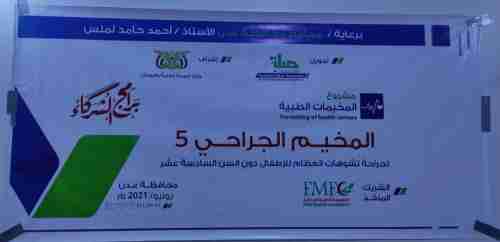 اقيم صباح اليوم الحفل الختامي للمخيم الجراحي الخامس لجراحات تشوهات العظام للاطفال دون سن السادسة عشر الذي نفذته المؤسسة الطبية الميدانية في مستوصف النهضة التخصصي بالمنصورة،و بدعم من مؤسسة صلة للتنمية.