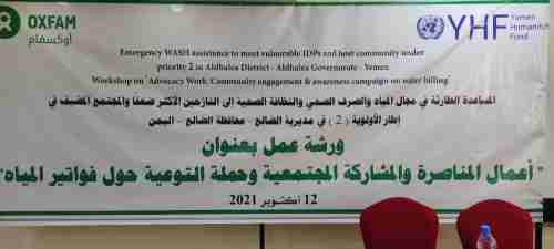 افتتح معالي وزير المياه والبيئة المهندس /توفيق الشرجبي واللواء /علي مقبل صالح محافظ محافظة الضالع صباح اليوم بالعاصمة عدن الورشة الخاصة باعمال المناصرة والمشاركة المجتمعية وحملة التوعية حول فواتير المياه لمؤسسة المياه بمدينة الضالع والتي نظمتها منظمة اوكسفام ضمن برنامج المساعدة الطارئة في مجال المياه والصرف الصحي والنظافة الصحية ،الى النازحين الاكثرضعفا والمجتع المضيف في اطار (2) في مديرية الضالع.