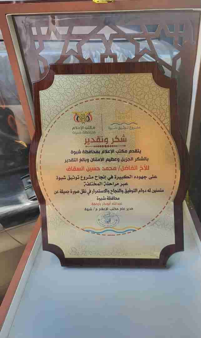 كرم مكتب إعلام محافظة شبوة ابن حضرموت الشخصية الوطنية الأخ محمد السقاف بدرع الشكر والتقدير. وجاءت خطوة التكريم نظرا جهوده الشخصية الكبيرة وتحركاته من خلال حديثه عن شبوة في كل المجالس والمواقع بعفويته الصادقة تجاه شبوة وأبناؤها، ولمساهمته الفاعلة في مشروع توثيق محافظة شبوة. وقال السقاف إن شبوة هي حضرموت والعكس صحيح، فشبوة وحضرموت إرث تاريخي اجتماعي ولا أحد يزايد عليه. وقدم مكتب إعلام شبوة رسالة شكر وتقدير للاخ السقاف على مواقفه الثابتة تجاه أبناء المحافظة، وجهوده الممبذولة والمتواصلة في خدمة شبوة.