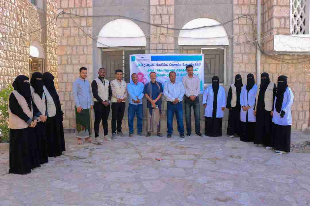دشّن مدير عام مديرية بروم ميفع الدكتور خالد حسن الجوهي صباح اليوم بمعية الدكتور عمر علي باجبار مدير دائرة المنظمات ومنسق البنك الدولي بمكتب الصحة العامة والسكان بالمحافظة والدكتور سالم أحمد بارميل مدير مكتب الصحة بالمديرية المخيم التوعوي وعيادة الكشف المبكر عن سرطان الثدي بمديرية بروم ميفع. ويأتي المخيم بتنفيذ مؤسسة حضرموت لمكافحة السرطان (أمل) بالتنسيق مع ملتقى شباب بروم التطوعي وفريق رفقاء التطوعي. ويهدف المخيم إلى زيادة الوعي بين آهالي المديرية حول مرض السرطان ومسبباته وأعراضه وكيفيه السلامه منه وتعلم وسائل الكشف المبكر . واحتوى برنامج المخيم على إقامة عيادة للكشف المبكر عن سرطان الثدي وفحص النساء بالمركز الصحي ببروم حيث تم خلالها الكشف على مجموعة من النساء عن طريق دكتورة مختصة لمعرفة ما اذا كانت أي منهن تُعاني من أي ألم أو اصابة متكررة في بعض المناطق الحساسة. وشمل المخيم التوعوي على إقامة محاضرات توعوية صحية لطلاب المدارس والثانوية البالغ عددهم حوالي(164) طالب لتوعيتهم حول مسببات السرطان وآثاره الجانبيه في حياة الشباب، واستعراض أبرز العوامل المسببة له كالتدخين والتبغ وملوثات البيئة،إلى جانب التركيز على أهمية التغذية الصحيحة التي تساعد الجسم على مقاومة مختلف الآفات. كما تم أيضاً إقامة محاضرات توعوية صحية لطالبات الثانويات البالغ عددهن حوالي (128)طالبة لإيضاح أهمية الفحص الدوري لسرطان الثدي وذلك لتجنب خطر الاصابة به مبكرا لاقدّر الله، وتدريبهن على طريقة الفحص الذاتي وتوجيههن إلى عيادات مؤسسة حضرموت لمكافحة السرطان في حال وجود اشتباه بأي حالة أو ظهور أعراض للمرض. كما تخلل الجانب التوعوي من المخيم أيضاً تعليق بوسترات توعوية بمسببات ومخاطر السرطان وتوزيع برشورات توعوية تهدف إلى شرح ماتم إعطائه للطلاب والطالبات خلال عملية التوعية. من جهتها شكرت قيادة السلطة المحلية وآهالي المديرية مؤسسة حضرموت لمكافحة السرطان على جهودها الكبيرة في اقامة هذا المخيم وتوعية الناس بمخاطر السرطان وكيفية الوقاية منه. ورحب المدير التنفيذي للمؤسسة الدكتور وليد البطاطي بالشراكات مع المبادرات والملتقيات التطوعية ومنظمات المجتمع المدني المهتمة بالمخيمات الطبية والعيادات المتنقلة لتستطيع من خلال هذه البرامج توصيل خدماتها للعديد من المناطق وخاصة التي تكون خارج نطاق عملها.