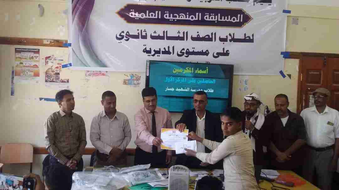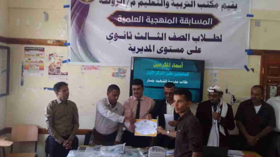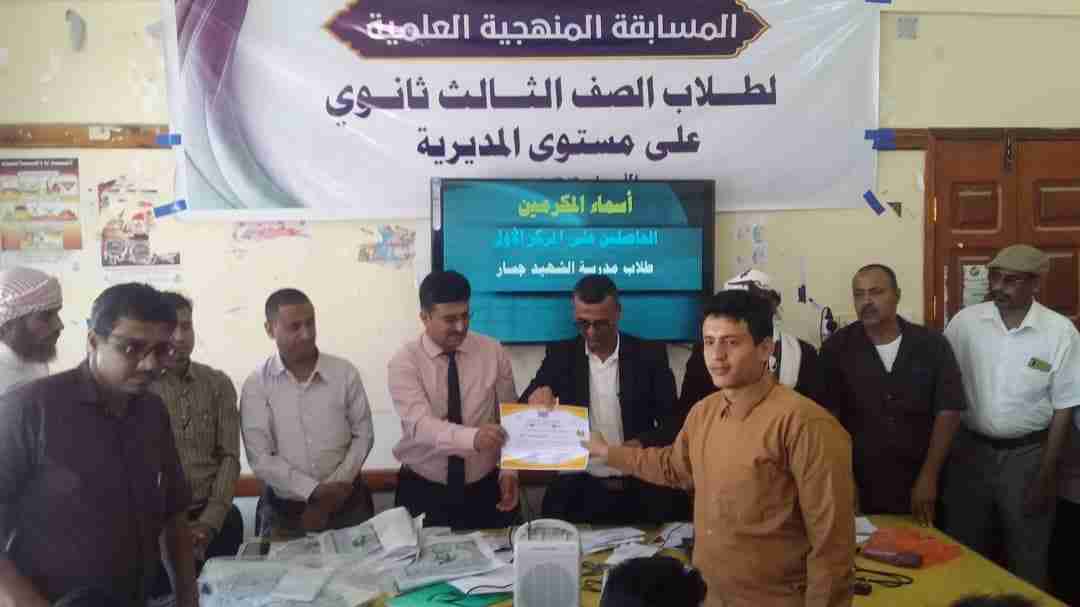 . كتب :صلاح مسعد مسرور حصدت ثانوية الشهيد جسار المركز الاول في المسابقة العلمية المنهجية للصف الثالث التي اقيمت صباح اليوم الاربعاء الموافق 1/3/2023 بمبنى مكتب التربية بمديرية الروضة بمشاركة خمس ثانويات. ونظمت المسابقة من قبل مكتب التربية والتعليم بمديرية الروضة وبأشراف قسم الرقابة والتفتيش التربوي بمحافظة شبوة وبحضور مدير عام المديرية /عاتق حبتور . وشهدت المسابقة التي نظمت لاول مرة من نوعها بالمديرية منافسة حامية الوطيس بين الثانويات الخمس المشاركة واستطاع متفوقوا الصف الثالث بثانوية الشهيد جسار بكل إرادة واصرار ان يخطفوا المركز الاول على منافسهم الشرس ثانوية الفقيد الحامد بفارق نقطة واحدة فقط. وقد جاء ترتيب الثانويات الخمس المتنافسة على النحو الآتي: ثانوية الشهيد جسار اولآ وثانوية الفقيد الحامد ثانيآ بينما حصدت ثانوية الحيرة /سلمون المركز الثالث بفارق ربع نقطة عن ثانوية عمقين التي جاءت في المركز الرابع تليها ثانوية الشعيب في المركز الخامس. وكرم الطلاب المشاركون من قبل/ عاتق حبتور مدير عام مديرية الروضة والمدير /عليوة مدير الرقابة والتفتيش التربوي بالمحافظة والمدير/عمر بن مسلم حبتور مدير التربية والتعليم بالمديرية. وتم ايضآ تكريم اللجنة المنظمة للمسابقة وكذا لجنة التحكيم للمنافسة العلمية كما تم تكريم الشخصية التربوية المؤثرة بطيب إلاثر المرحوم/ هادي محمد عبدالصبور. ويذكر إن الطلاب المشاركون من ثانوية الشهيد جسار قد تم اختيارهم بعناية فائقة ودقة متناهية من قبل مدرسيهم وهم الطلاب التالية اسمائهم: 1-راضي باعفي. 2-مرتضى مسرور. 3-ابوبكر دابي. 4- ابراهيم القباص. 5-احمد يوسف الرفاعي 6- عبدالرحمن بافقير. وقد ادار المسابقة العلمية المنهجية الاولى للصف الثالث ثانوي المذيع الداخلي الاستاذ :يحيئ علي الضامري .. حصدت ثانوية الشهيد جسار المركز الاول في المسابقة العلمية المنهجية للصف الثالث التي اقيمت صباح اليوم الاربعاء الموافق 1/3/2023 بمبنى مكتب التربية بمديرية الروضة بمشاركة خمس ثانويات. ونظمت المسابقة من قبل مكتب التربية والتعليم بمديرية الروضة وبأشراف قسم الرقابة والتفتيش التربوي بمحافظة شبوة وبحضور مدير عام المديرية /عاتق حبتور . وشهدت المسابقة التي نظمت لاول مرة من نوعها بالمديرية منافسة حامية الوطيس بين الثانويات الخمس المشاركة واستطاع متفوقوا الصف الثالث بثانوية الشهيد جسار بكل إرادة واصرار ان يخطفوا المركز الاول على منافسهم الشرس ثانوية الفقيد الحامد بفارق نقطة واحدة فقط. وقد جاء ترتيب الثانويات الخمس المتنافسة على النحو الآتي: ثانوية الشهيد جسار اولآ وثانوية الفقيد الحامد ثانيآ بينما حصدت ثانوية الحيرة /سلمون المركز الثالث بفارق ربع نقطة عن ثانوية عمقين التي جاءت في المركز الرابع تليها ثانوية الشعيب في المركز الخامس. وكرم الطلاب المشاركون من قبل/ عاتق حبتور مدير عام مديرية الروضة والمدير /عليوة مدير الرقابة والتفتيش التربوي بالمحافظة والمدير/عمر بن مسلم حبتور مدير التربية والتعليم بالمديرية. وتم ايضآ تكريم اللجنة المنظمة للمسابقة وكذا لجنة التحكيم للمنافسة العلمية كما تم تكريم الشخصية التربوية المؤثرة بطيب إلاثر المرحوم/ هادي محمد عبدالصبور. ويذكر إن الطلاب المشاركون من ثانوية الشهيد جسار قد تم اختيارهم بعناية فائقة ودقة متناهية من قبل مدرسيهم وهم الطلاب التالية اسمائهم: 1-راضي باعفي. 2-مرتضى مسرور. 3-ابوبكر دابي. 4- ابراهيم القباص. 5-احمد يوسف الرفاعي 6- عبدالرحمن بافقير. وقد ادار المسابقة العلمية المنهجية الاولى للصف الثالث ثانوي المذيع الداخلي الاستاذ :يحيئ علي الضامري .