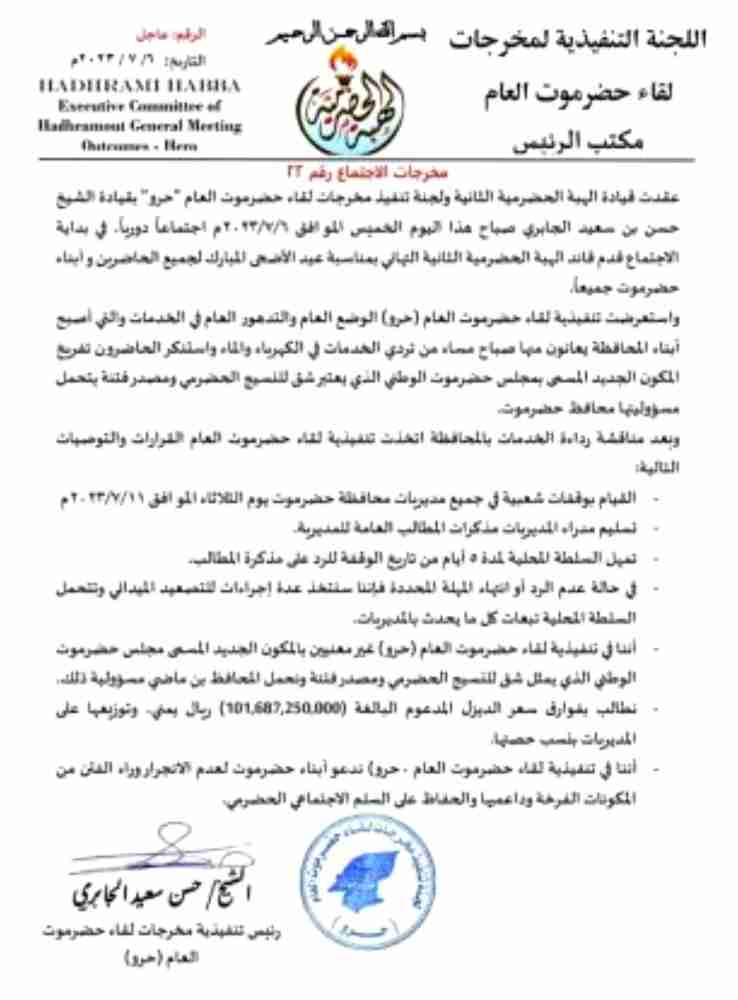 وبعد مناقشة رداءة الخدمات بالمحافظة اتخذت تنفيذية لقاء حضرموت العام القرارات والتوصيات التالية: