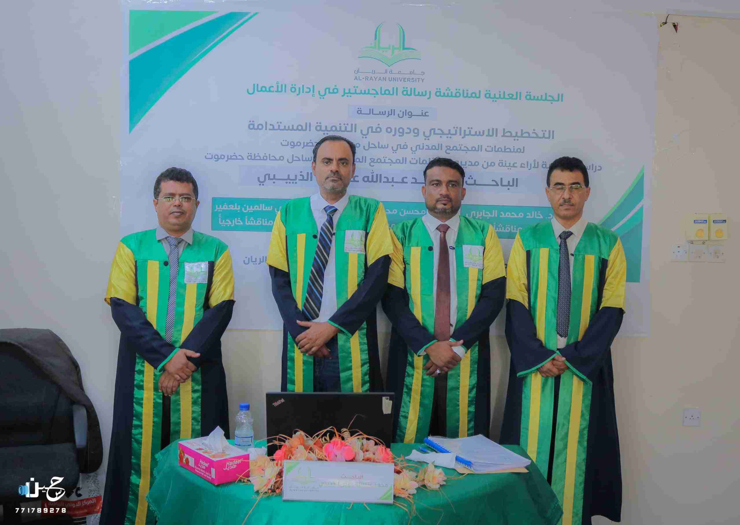 المكلا | حسين عمر بازنبور الإثنين | 30 أكتوبر | 2023م نوقشت صباح اليوم بجامعة الريان الجلسة العلنية لرسالة الماجستير للباحث محمد عبدالله الذييبي في إدارة الأعمال، والموسومة بالتخطيط الاستراتيجي ودوره في التنمية المستدامة لمنظمات المجتمع المدني في ساحل محافظة حضرموت، والتي تُمثّل دراسة ميدانية لآراء عيّنة من مديري منظمات المجتمع المدني في ساحل محافظة حضرموت. وتكوّنت لجنة المناقشة من الدكتور هاني سالمين بلعفير كعضو ومناقش خارجي والدكتور محسن محمد بن كليب كرئيسا ومشرفا علميا والدكتور خالد محمد الجابري كعضوا ومناقشا داخليا، والذين أبدوا رأيهم ومجموعة من الملاحظات التي تصوّب عمل الباحث وتعزز قيمة الرسالة وذلك بعد الاستماع للرسالة من قِبل الباحث. وفي الآخير وبعد تقديم المشرفين لمجموعة من الملاحظات والتوصيات الهادفة لتطوير مضمون الرساله،تم اعلان النتيجة النهائية لجلسة المناقشة والتي أُعلنت بإعطاء الباحث درجة الماجستير بإمتياز من جامعة الريان بالمكلا،وسط حضور ومشاركة وفرحة من قِبل أهالي وأصدقاء الباحث. في السياق ذاته هنأ مدير الصندوق الاجتماعي للتنمية فرع المكلا الدكتور عوض سالم لقصم وجميع منتسبي الفرع الباحث على نيله درجة الماجستير والذي يشغل وظيفة الضابط المجتمعي لبرنامج النقد مفابل العمل بفرع المكلا، متمنين له دوام التوفيق والنجاح في مشواره وتحصيله العلمي ومهامه العملية بالفرع.نوقشت صباح اليوم بجامعة الريان الجلسة العلنية لرسالة الماجستير للباحث محمد عبدالله الذييبي في إدارة الأعمال، والموسومة بالتخطيط الاستراتيجي ودوره في التنمية المستدامة لمنظمات المجتمع المدني في ساحل محافظة حضرموت، والتي تُمثّل دراسة ميدانية لآراء عيّنة من مديري منظمات المجتمع المدني في ساحل محافظة حضرموت. وتكوّنت لجنة المناقشة من الدكتور هاني سالمين بلعفير كعضو ومناقش خارجي والدكتور محسن محمد بن كليب كرئيسا ومشرفا علميا والدكتور خالد محمد الجابري كعضوا ومناقشا داخليا، والذين أبدوا رأيهم ومجموعة من الملاحظات التي تصوّب عمل الباحث وتعزز قيمة الرسالة وذلك بعد الاستماع للرسالة من قِبل الباحث. وفي الآخير وبعد تقديم المشرفين لمجموعة من الملاحظات والتوصيات الهادفة لتطوير مضمون الرساله،تم اعلان النتيجة النهائية لجلسة المناقشة والتي أُعلنت بإعطاء الباحث درجة الماجستير بإمتياز من جامعة الريان بالمكلا،وسط حضور ومشاركة وفرحة من قِبل أهالي وأصدقاء الباحث. في السياق ذاته هنأ مدير الصندوق الاجتماعي للتنمية فرع المكلا الدكتور عوض سالم لقصم وجميع منتسبي الفرع الباحث على نيله درجة الماجستير والذي يشغل وظيفة الضابط المجتمعي لبرنامج النقد مفابل العمل بفرع المكلا، متمنين له دوام التوفيق والنجاح في مشواره وتحصيله العلمي ومهامه العملية بالفرع.