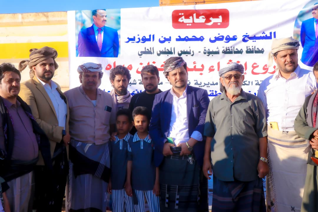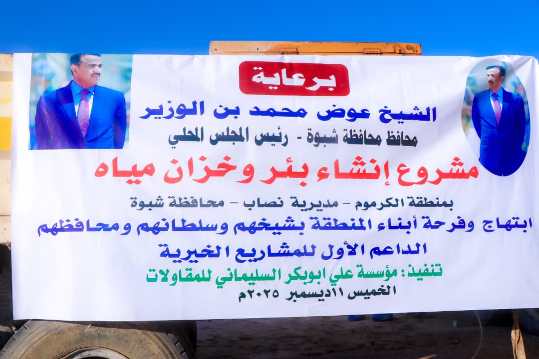 برعاية كريمة من محافظ محافظة شبوة ورئيس المجلس المحلي، الشيخ عوض محمد بن الوزير، جرى تدشين مشروع ضخ المياه بنجاح من بئر إلى خزان مياه في منطقة الكرموم بمديرية نصاب بمحافظة شبوة. ويأتي هذا المشروع تلبيةً لاحتياجات أهالي المنطقة، واهتماماً بجهود رفع مستوى الخدمات الأساسية، وفي مقدمتها المياه، ويهدف إلى توفير مصدر مياه مستدام لأهالي الكروم والمناطق المجاورة. ويُعد هذا التدشين، الذي تم يوم الخميس 19 ديسمبر 2025م، جزءاً من خطط السلطة المحلية لتعزيز البنية التحتية والخدمات في مختلف مديريات المحافظة. وقد نفّذت هذا المشروع مؤسسة علي أبوبكر السليماني لحفر الآبار الارتوازية وخدمة حقول النفط. وخلال التدشين، ألقى الأخ أسامة سالم بكران كلمة باسم أهالي منطقة الكرموم بنصاب، قدم فيها الشكر لمحافظ شبوة الشيخ عوض بن الوزير على رعايته الكريمة لحفر البئر وخزان المياه، وأشاد بجهود كل من ساهم في نجاح حفر البئر، وخص بالذكر مؤسسة علي أبوبكر السليماني لحفر الآبار، منوهاً إلى أن هذا البئر سيعود بالفائدة على جميع سكان المنطقة.