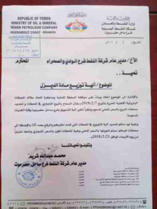 أقرت السلطة المحلية بمحافظة حضرموت واتحاد ملاك محطات البترول ألأهلية العمل بألية جديد في توزيع وبيع المحروقات والمشتقات النفطية في كافة مدن المحافظة ساحلاً ووادي في أطار جهود معالجة أزمة شحه توفر مادة الديزل. حيث ستشمل الآلية الجديدة السماح لمحطات تعبة الوقود بالبيع التجاري لمادة الديزل وتحديد محطات معينة يتم من خلالها توفير وبيعها المادة بالسعر المحلي "المدعوم". وقال مصدر مسئول في قيادة شركة النفط بساحل حضرموت أن هذه الإلية والتي تمت بالتوافق مع كل من السلطة المحلية واتحاد ملاك محطات البترول الأهلية وقيادة شركة النفط بالوادي جاءت للتخفيف من وطأة شحه المحروقات من مادة الديزل نتيجة قلة الكميات المدعومة الواردة من مادة الديزل جراء ارتفاع أسعار المادة عالمياً وانخفاض قيمة العملة الوطنية (الريال اليمني) أمام الدولار الأمريكي. وأكد المصدر المسئول بالقول أن السلطات بالمحافظة وحرصاً منها على توفير المادة للمواطنين والمصلحة العامة عمدت إلى مخاطبة سلطات المحلية في المديريات لتحديد محطة واحد في كل مدينة يتم خلالها توفير مادة الديزل بالسعر المحلي "المدعوم"، والذي سيُخصص فقط للمزارعين والسيارات الصغيرة والأجرة وكذلك المُستشفيات الحكومة. وأن تكون هذه المحطات تحت الأشراف والمسئولية المباشرة للسلطات المحلية في المديريات. على أن يتم بيع المادة بسعرها التجاري في بقية المحطات. وشدد المصدر المسئول بشركة النفط بالمحافظة على أن هنالك عدد من الضوابط تم تحديدها للمحطات التي ستقوم ببيع المادة بالسعر المحلي المدعوم وهي كالتالي: 1- عدم تعبئة القاطرات و رؤوس القاطرة وسيارات السكس والدينات والباصات السياحية وغيرها من المعدات الثقيلة كالشيولات والبوكلينات والحفارات. 2- عدم تعبئة الدبب والبراميل. 3- عدم تخزين أي مواد بترولية بأي كميات كانت من خزان المحطة مهما كانت الأسباب إلا بموافقة مسبقة من الجهات المختصة في شركة النفط. 4- يتم تعبئة السيارات بما لا يزيد عن (40) لتر لكل سيارة 5- يمنع منعاً باتا تعبئة العباري السمكية بالسعر المدعوم.