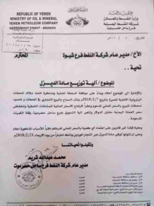 محلي حضرموت يقر آلية عمل جديدة لتوزيع وبيع النفط .. وثائق