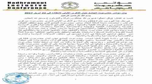 حيا مؤتمر حضرموت الجامع الذكرى الأولى لانعقاد في 22 ابريل 2017 التي جمعت مختلف أطياف المجتمع الحضرمي ومكوناته القبلية والمدنية ؛ يمثلون الشرائح الاجتماعية والقوى السياسية والحزبية والاتحادات النقابية والمهنية والاجتماعية والشعبية ومنظمات المجتمع المدني والشخصيات العامة والمثقفين والأكاديميين على اختلاف توجهاتهم الفكرية وانتماءاتهم السياسية ومواقعهم الاجتماعية ،و الذين تقاطروا من كل المناطق والمديريات ساحلًا وواديًا وهضبة وصحراء رجالا ونساء شبابا ، تلبيةً لنداء حلف حضرموت مجسدين روح الإخاء والترابط والتعايش قولًا وعملًا وثقافة وتصالحًا وتسامحًا ، وتضامنًا بين كل مكونات المجتمع الحضرمي.
