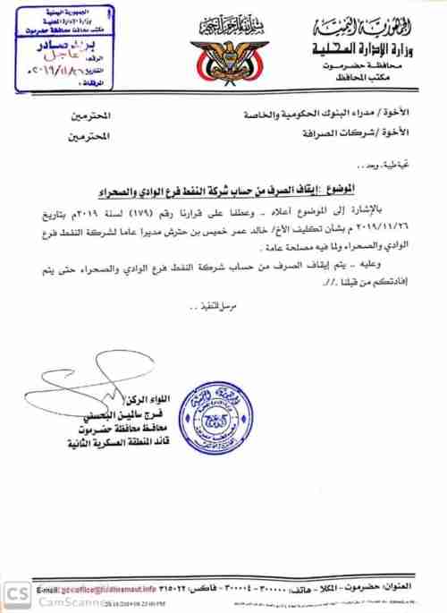 محافظ حضرموت يوجه بإيقاف الصرف من حساب فرع شركة النفط بالوادي(وثيقة)