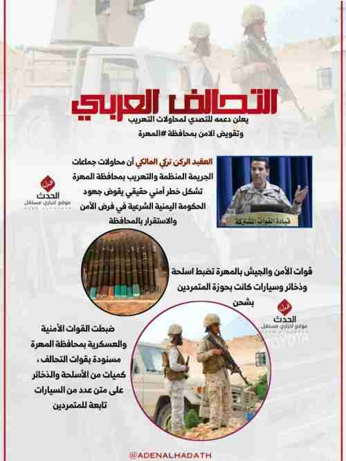 إنفوجرافيك/بدعم التحالف العربي /قوات الأمن والجيش بالمهرة تضبط اسلحة وذخائر وسيارات كانت بحوزة المتمردين بشحن