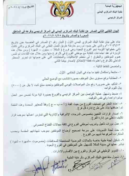 البيان النقابي الثاني الصادر عن نقابة البنك المركزي اليمني في المركز الرئيسي وفرعه في المناطق