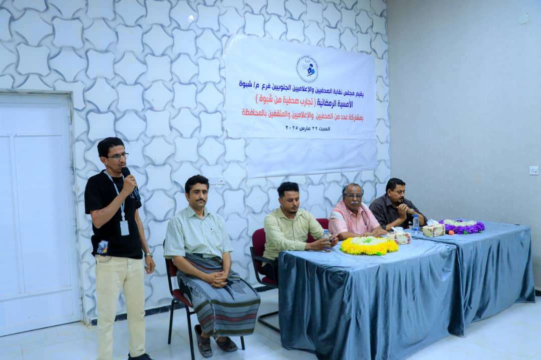 في أمسية رمضانية مميزة .. نقابة الصحفيين والإعلاميين الجنوبيين بشبوة تستعرض تجارب صحفية رائدة بالمحافظة نظمت نقابة الصحفيين والإعلاميين الجنوبيين بمحافظة شبوة مساء اليوم السبت أمسية رمضانية بقاعة مكتب الش...