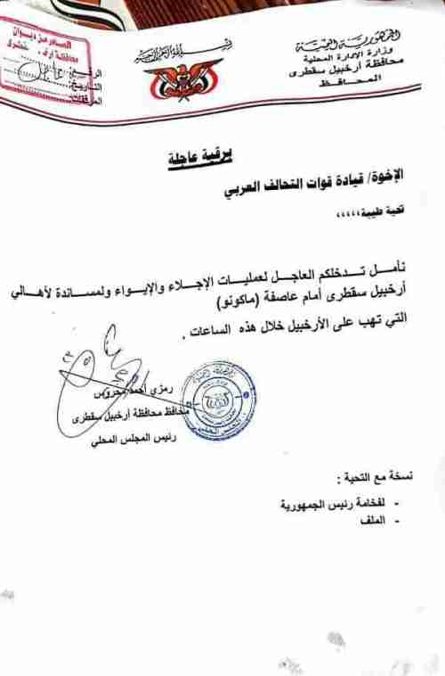 عاجل اعلان سقطرى جزيرة منكوبة .. والحكومة اليمنية توجه رسالة عاجلة للتحالف والمنظمات الدولية اعلنت الحكومة اليمنية محافظة ارخبيل سقطرى جزيرة منكوبة بسبب الإعصار المداري الذي داهمها .ووجهت الحكو...