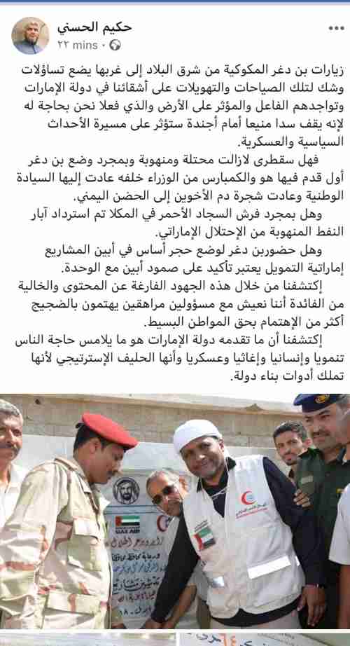 قيادي بارز في المقاومة الجنوبية ما تقدمه الامارات يلامس حاجة الناس تنموياً وانسانياً وعسكريا ومسؤلي الحكومة مراهقين قال القيادي في المقاومة الجنوبية الشيخ حكيم الحسني ان ما قدمته الامارات في المحافظات المحررة يلامس ح...