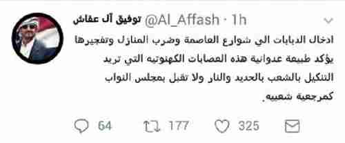 أول تصريح "لنجل صالح " حول آخر المعارك الدائرة في شوارع صنعاء صرح القيادي المؤتمري توفيق عفاش قبل قليل على موقع التدوين تويتر ان ما تقوم به جماعة الحوثي من اس...