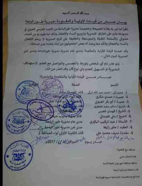 أحد مشائخ الصبيحة يؤيد قرار هدر دم أي خائن أو جاسوس شاهد الوثيقة أعلن الشيخ عصام عبده هزاع الجريوي تأييده الكامل للقرار الذي اتخذته القيادات العسكرية وقيادة المقاو...