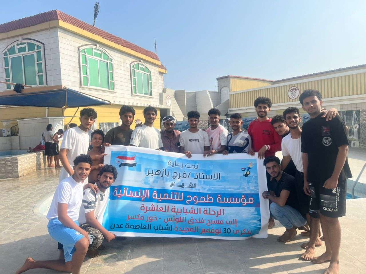 بمناسبة ذكرى 30 نوفمبر المجيدة .. مؤسسة طموح تقيم الرحلة الشبابية العاشرة إلى مسبح فندق اللوتس بخورمكسر أقامت صباح اليوم الاحد مؤسسة طموح للتنمية الانسانية الرحلة الشبابية العاشرة بمناسبة ذكرى 30 نوفمبر ا...