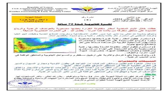 الأرصاد تحذر من أمطار غزيرة مصحوبة بالبرد والرياح الشديدة أكد مركز التنبؤات الجوية والإنذار المبكر في الهيئة العامة للطيران المدني والأرصاد، في نشرته الجوية ا...